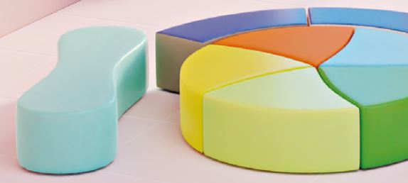 Percorsi morbidi e modulari per attività motorie, equilibrio e gioco simbolico. Rivestimenti ignifughi Classe 1, senza PVC e ftalati, completamente sfoderabili, agganci in velcro per unire i moduli.